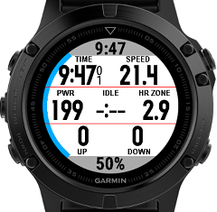 This data field supports the ANT+ power sensor profile in order to be able to use e.g. a Stryd power sensor. The pairing with the ANT+ power sensor is done automatically by the data field. During the workout following information can be shown on the data pages: