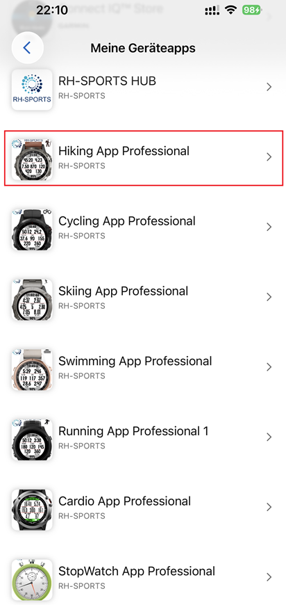 Step 4: Select RH-SPORTS product If you would like to change the settings for a RH-SPORTS application, please click the marked button My device apps as shown in the pictures below: