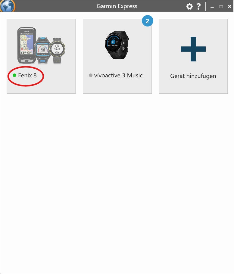 After that you should be able to see your Garmin device as shown in the picture below. If not, please add your device first. For details refer to the documentation provided by Garmin.