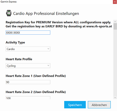 Step 6: Change Configuration Please note that configuration changes ONLY apply on your Garmin device if you have entered the proper PREMIUM key in the field marked in the picture below. The key consists of two times four characters separated by a space in between. If the proper key is entered, please make the configurations according to your needs and press the "Save" button at the end. The Garmin Express Software will update the configurations on your device. In case of errors, please refer to the documentation provided by Garmin.